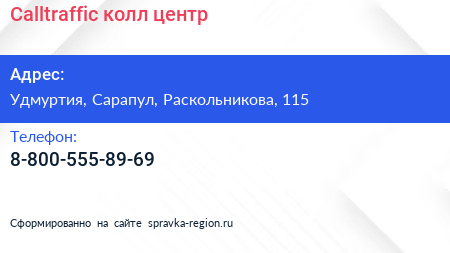 Calltraffic, колл-центр по адресу Удмуртия, Сарапул, Раскольникова, 115 в дальнейшем Организация, размещена в следующих категориях: