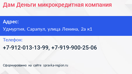 Дам Деньги, микрокредитная компания по адресу Удмуртия, Сарапул, улица Ленина, 2а к1 в дальнейшем Организация, размещена в следующих категориях: