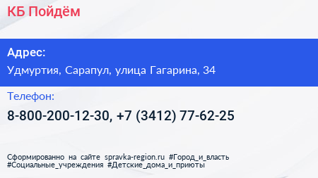 КБ Пойдём по адресу Удмуртия, Сарапул, улица Гагарина, 34 в дальнейшем Организация, размещена в следующих категориях: