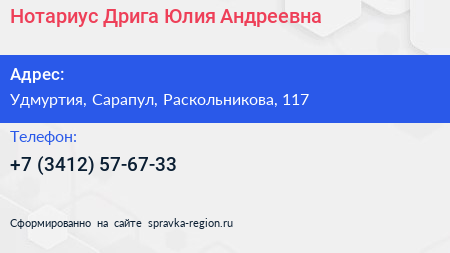 Нотариус Дрига Юлия Андреевна по адресу Удмуртия, Сарапул, Раскольникова, 117 в дальнейшем Организация, размещена в следующих категориях: