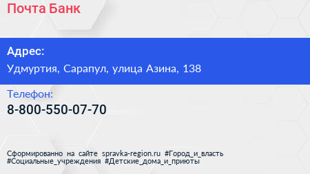 Почта Банк по адресу Удмуртия, Сарапул, улица Азина, 138 в дальнейшем Организация, размещена в следующих категориях: