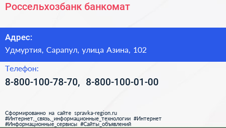 Россельхозбанк, банкомат по адресу Удмуртия, Сарапул, улица Азина, 102 в дальнейшем Организация, размещена в следующих категориях: