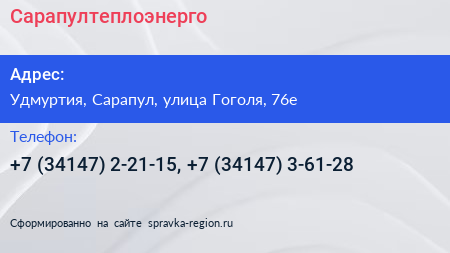 Сарапултеплоэнерго по адресу Удмуртия, Сарапул, улица Гоголя, 76е в дальнейшем Организация, размещена в следующих категориях: