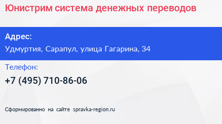 Юнистрим, система денежных переводов по адресу Удмуртия, Сарапул, улица Гагарина, 34 в дальнейшем Организация, размещена в следующих категориях: