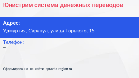 Юнистрим, система денежных переводов по адресу Удмуртия, Сарапул, улица Горького, 15 в дальнейшем Организация, размещена в следующих категориях: