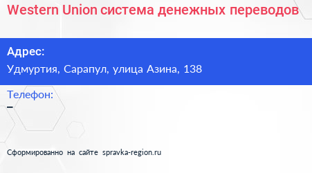 Western Union, система денежных переводов по адресу Удмуртия, Сарапул, улица Азина, 138 в дальнейшем Организация, размещена в следующих категориях: