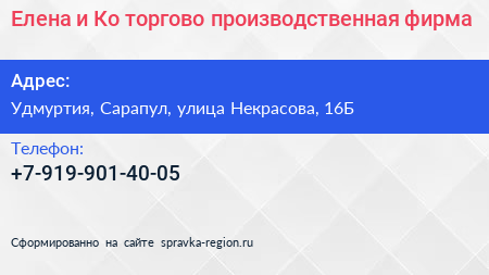 Елена и Ко, торгово-производственная фирма по адресу Удмуртия, Сарапул, улица Некрасова, 16Б в дальнейшем Организация, размещена в следующих категориях: