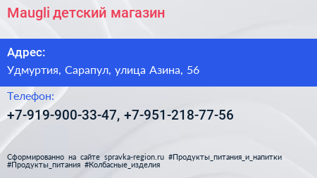 Maugli, детский магазин по адресу Удмуртия, Сарапул, улица Азина, 56 в дальнейшем Организация, размещена в следующих категориях:
