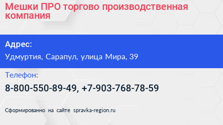 Мешки-ПРО, торгово-производственная компания по адресу Удмуртия, Сарапул, улица Мира, 39 в дальнейшем Организация, размещена в следующих категориях: