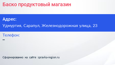 Баско, продуктовый магазин по адресу Удмуртия, Сарапул, Железнодорожная улица, 23 в дальнейшем Организация, размещена в следующих категориях: