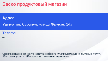Баско, продуктовый магазин по адресу Удмуртия, Сарапул, улица Фрунзе, 14а в дальнейшем Организация, размещена в следующих категориях: