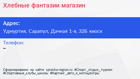 Хлебные фантазии, магазин по адресу Удмуртия, Сарапул, Дачная 1-я, 32Б киоск в дальнейшем Организация, размещена в следующих категориях: