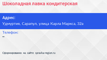 Шоколадная лавка, кондитерская по адресу Удмуртия, Сарапул, улица Карла Маркса, 32а в дальнейшем Организация, размещена в следующих категориях: