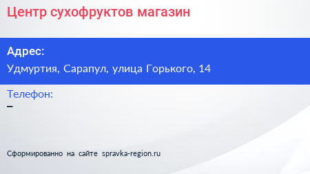 Центр сухофруктов, магазин по адресу Удмуртия, Сарапул, улица Горького, 14 в дальнейшем Организация, размещена в следующих категориях: