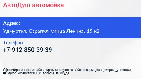 АвтоДуш, автомойка по адресу Удмуртия, Сарапул, улица Ленина, 15 к2 в дальнейшем Организация, размещена в следующих категориях: