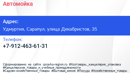 Автомойка по адресу Удмуртия, Сарапул, улица Декабристов, 35 в дальнейшем Организация, размещена в следующих категориях: