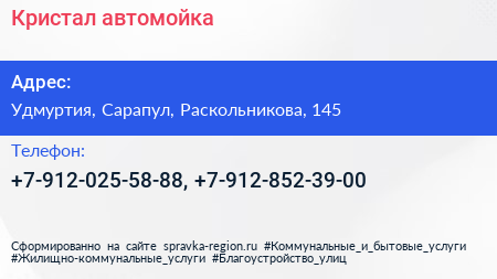 Кристал, автомойка по адресу Удмуртия, Сарапул, Раскольникова, 145 в дальнейшем Организация, размещена в следующих категориях: