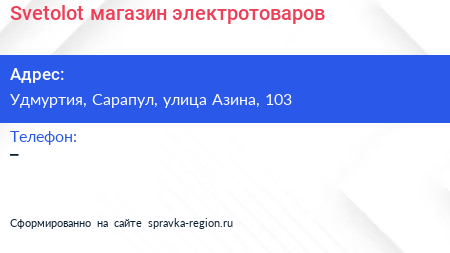 Svetolot, магазин электротоваров по адресу Удмуртия, Сарапул, улица Азина, 103 в дальнейшем Организация, размещена в следующих категориях: