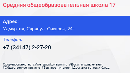 Средняя общеобразовательная школа №17 по адресу Удмуртия, Сарапул, Сивкова, 24г в дальнейшем Организация, размещена в следующих категориях: