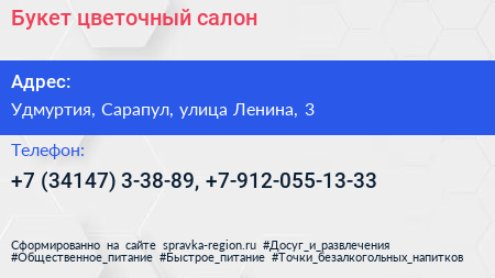 Букет, цветочный салон по адресу Удмуртия, Сарапул, улица Ленина, 3 в дальнейшем Организация, размещена в следующих категориях: