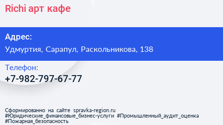 Richi, арт-кафе по адресу Удмуртия, Сарапул, Раскольникова, 138 в дальнейшем Организация, размещена в следующих категориях: