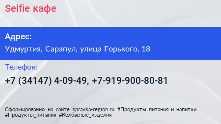 Selfie, кафе по адресу Удмуртия, Сарапул, улица Горького, 18 в дальнейшем Организация, размещена в следующих категориях: