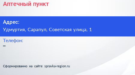 Аптечный пункт по адресу Удмуртия, Сарапул, Советская улица, 1 в дальнейшем Организация, размещена в следующих категориях: