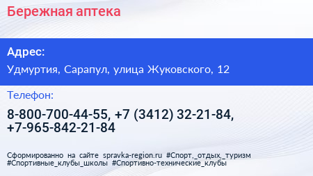 Бережная аптека по адресу Удмуртия, Сарапул, улица Жуковского, 12 в дальнейшем Организация, размещена в следующих категориях: