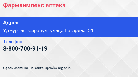 Фармаимпекс, аптека по адресу Удмуртия, Сарапул, улица Гагарина, 31 в дальнейшем Организация, размещена в следующих категориях: