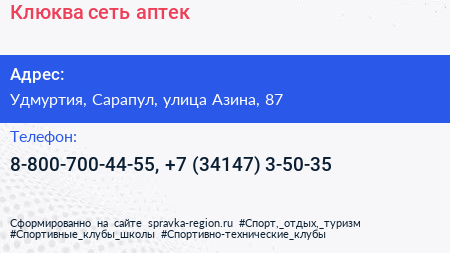 Клюква, сеть аптек по адресу Удмуртия, Сарапул, улица Азина, 87 в дальнейшем Организация, размещена в следующих категориях: