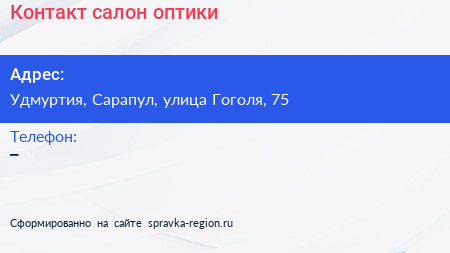 Контакт, салон оптики по адресу Удмуртия, Сарапул, улица Гоголя, 75 в дальнейшем Организация, размещена в следующих категориях: