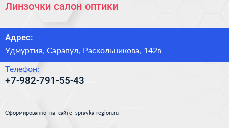 Линзочки, салон оптики по адресу Удмуртия, Сарапул, Раскольникова, 142в в дальнейшем Организация, размещена в следующих категориях: