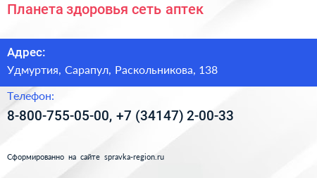 Планета здоровья, сеть аптек по адресу Удмуртия, Сарапул, Раскольникова, 138 в дальнейшем Организация, размещена в следующих категориях: