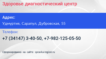 Здоровье, диагностический центр по адресу Удмуртия, Сарапул, Дубровская, 55 в дальнейшем Организация, размещена в следующих категориях:
