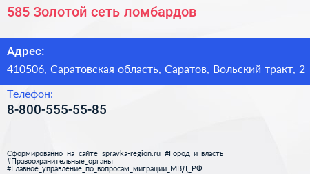 585*Золотой, сеть ломбардов по адресу 410506, Саратовская область, Саратов, Вольский тракт, 2 в дальнейшем Организация, размещена в следующих категориях: