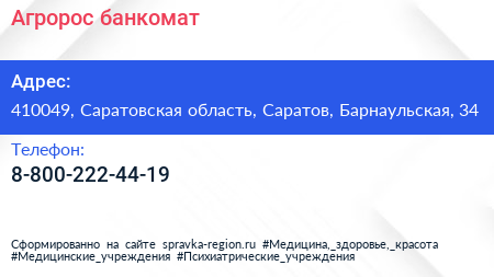Агророс, банкомат по адресу 410049, Саратовская область, Саратов, Барнаульская, 34 в дальнейшем Организация, размещена в следующих категориях: