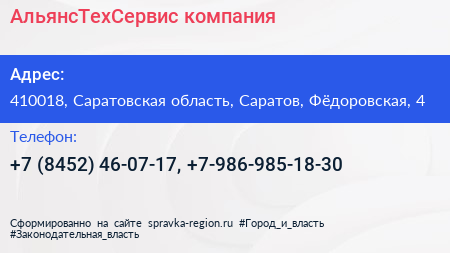 АльянсТехСервис, компания по адресу 410018, Саратовская область, Саратов, Фёдоровская, 4 в дальнейшем Организация, размещена в следующих категориях: