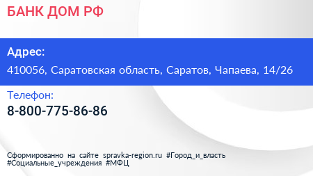 БАНК ДОМ.РФ по адресу 410056, Саратовская область, Саратов, Чапаева, 14/26 в дальнейшем Организация, размещена в следующих категориях: