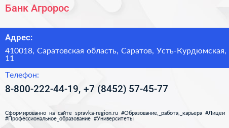 Банк Агророс по адресу 410018, Саратовская область, Саратов, Усть-Курдюмская, 11 в дальнейшем Организация, размещена в следующих категориях: