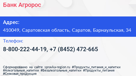 Банк Агророс по адресу 410049, Саратовская область, Саратов, Барнаульская, 34 в дальнейшем Организация, размещена в следующих категориях: