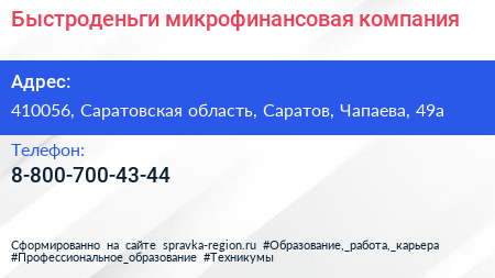Быстроденьги, микрофинансовая компания по адресу 410056, Саратовская область, Саратов, Чапаева, 49а в дальнейшем Организация, размещена в следующих категориях: