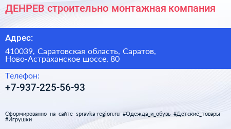 ДЕНРЕВ, строительно-монтажная компания по адресу 410039, Саратовская область, Саратов, Ново-Астраханское шоссе, 80 в дальнейшем Организация, размещена в следующих категориях: