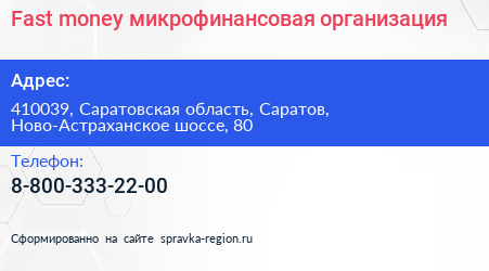 Fast money, микрофинансовая организация по адресу 410039, Саратовская область, Саратов, Ново-Астраханское шоссе, 80 в дальнейшем Организация, размещена в следующих категориях: