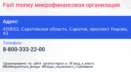 Fast money, микрофинансовая организация по адресу 410012, Саратовская область, Саратов, проспект Кирова, 43 в дальнейшем Организация, размещена в следующих категориях: