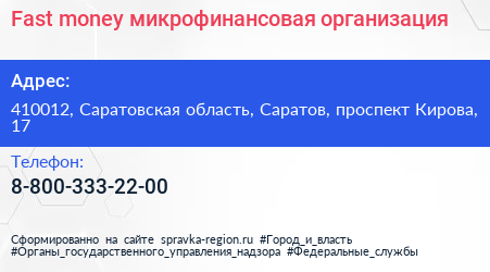 Fast money, микрофинансовая организация по адресу 410012, Саратовская область, Саратов, проспект Кирова, 17 в дальнейшем Организация, размещена в следующих категориях: