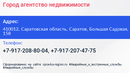 Город, агентство недвижимости по адресу 410012, Саратовская область, Саратов, Большая Садовая, 158 в дальнейшем Организация, размещена в следующих категориях: