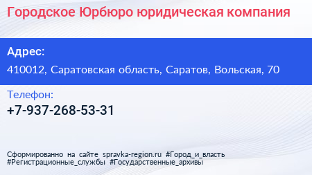 Городское Юрбюро, юридическая компания по адресу 410012, Саратовская область, Саратов, Вольская, 70 в дальнейшем Организация, размещена в следующих категориях: