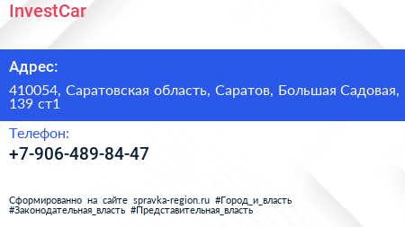InvestСar по адресу 410054, Саратовская область, Саратов, Большая Садовая, 139 ст1 в дальнейшем Организация, размещена в следующих категориях: