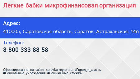 Легкие бабки, микрофинансовая организация по адресу 410005, Саратовская область, Саратов, Астраханская, 146 в дальнейшем Организация, размещена в следующих категориях: