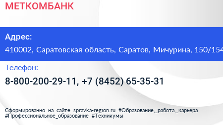 МЕТКОМБАНК по адресу 410002, Саратовская область, Саратов, Мичурина, 150/154 в дальнейшем Организация, размещена в следующих категориях: